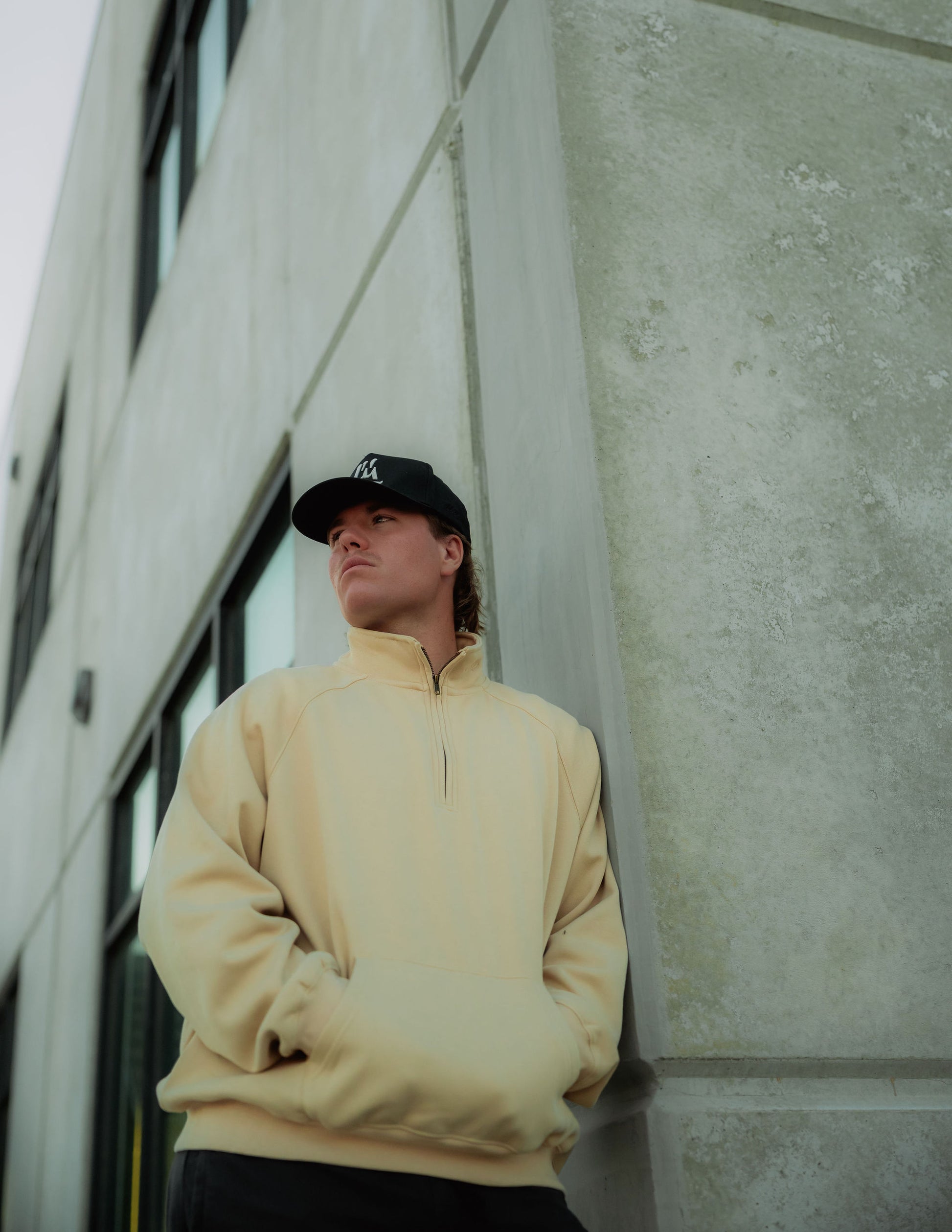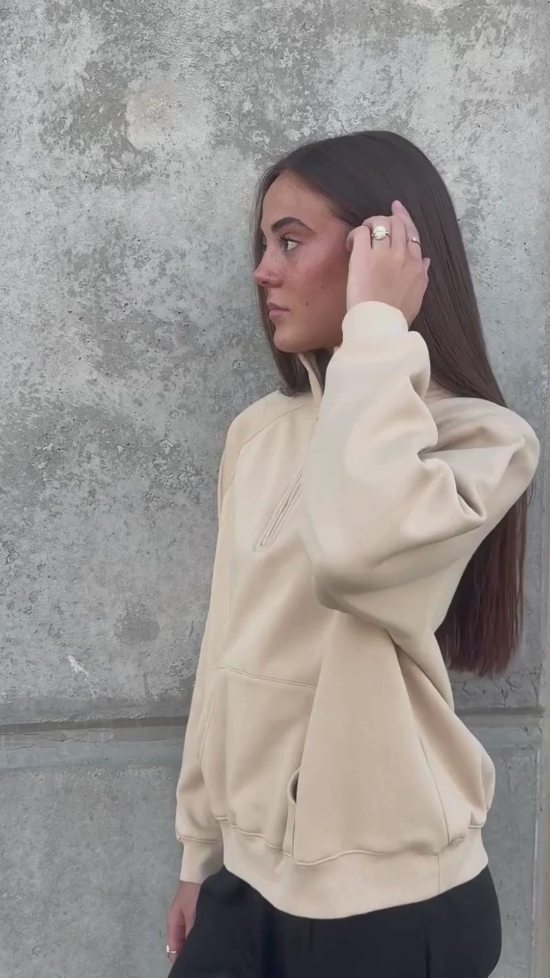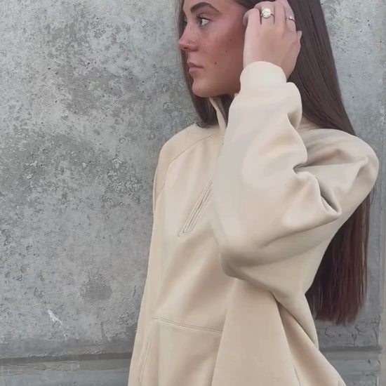 Long sleeve quarter zip sweatshirt composed of 100% cotton fleece, finished with a bronze zipper, rib knit cuffs, and an embroidered script logo on the collar. Featuring a kangaroo pouch pocket and an oversized fit.
